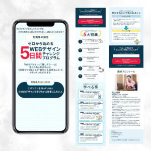 実際のレッスン写真を使用することで、信頼感を高めるとともに、閲覧者がレッスンの雰囲気を具体的にイメージしやすいデザインにしました。また、写真を右斜めの枠に配置することで、上達への期待感や前向きな印象を演出しています。